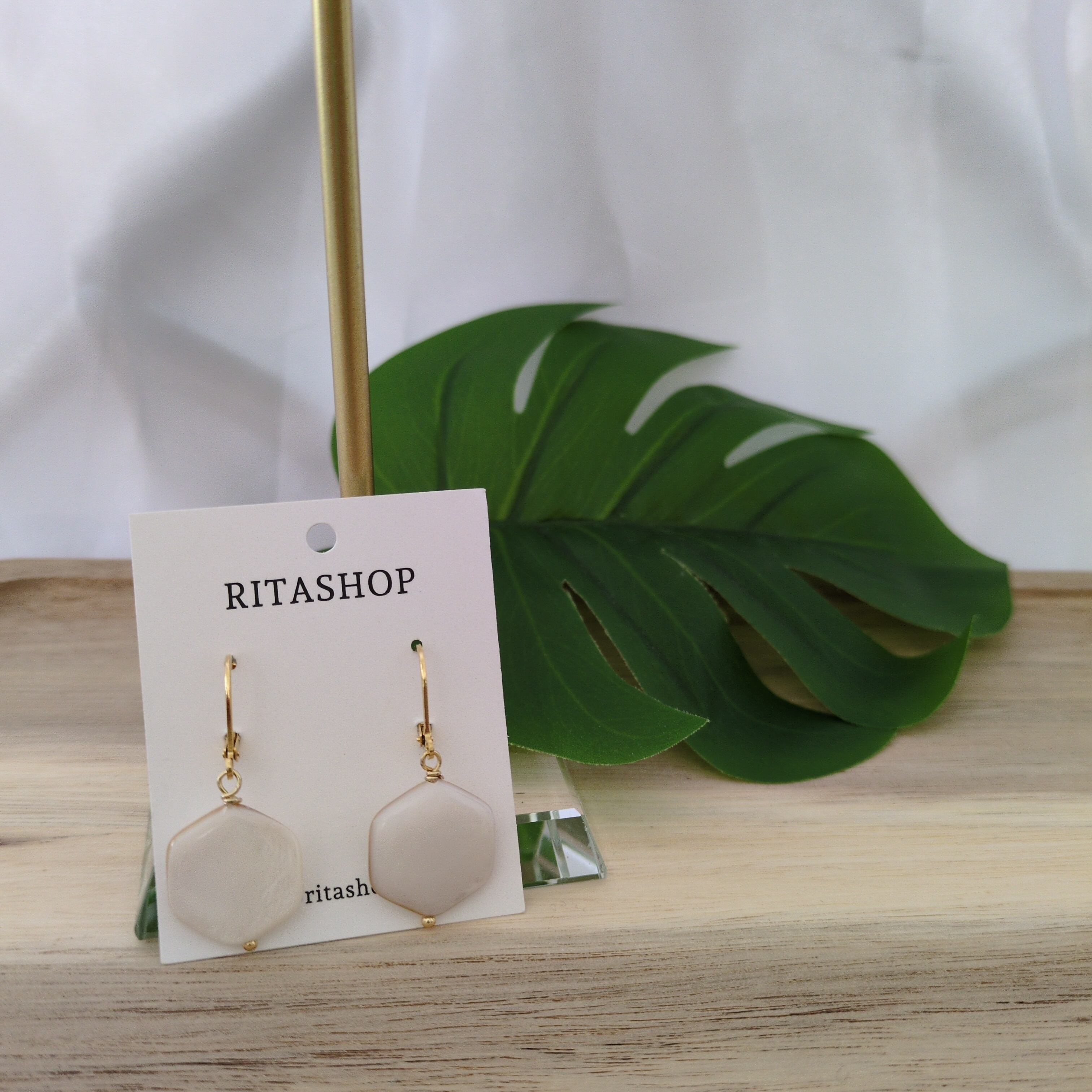 ツルツルの光沢のある存在感あるヘキサゴン(六角形)のシェルピアスです。