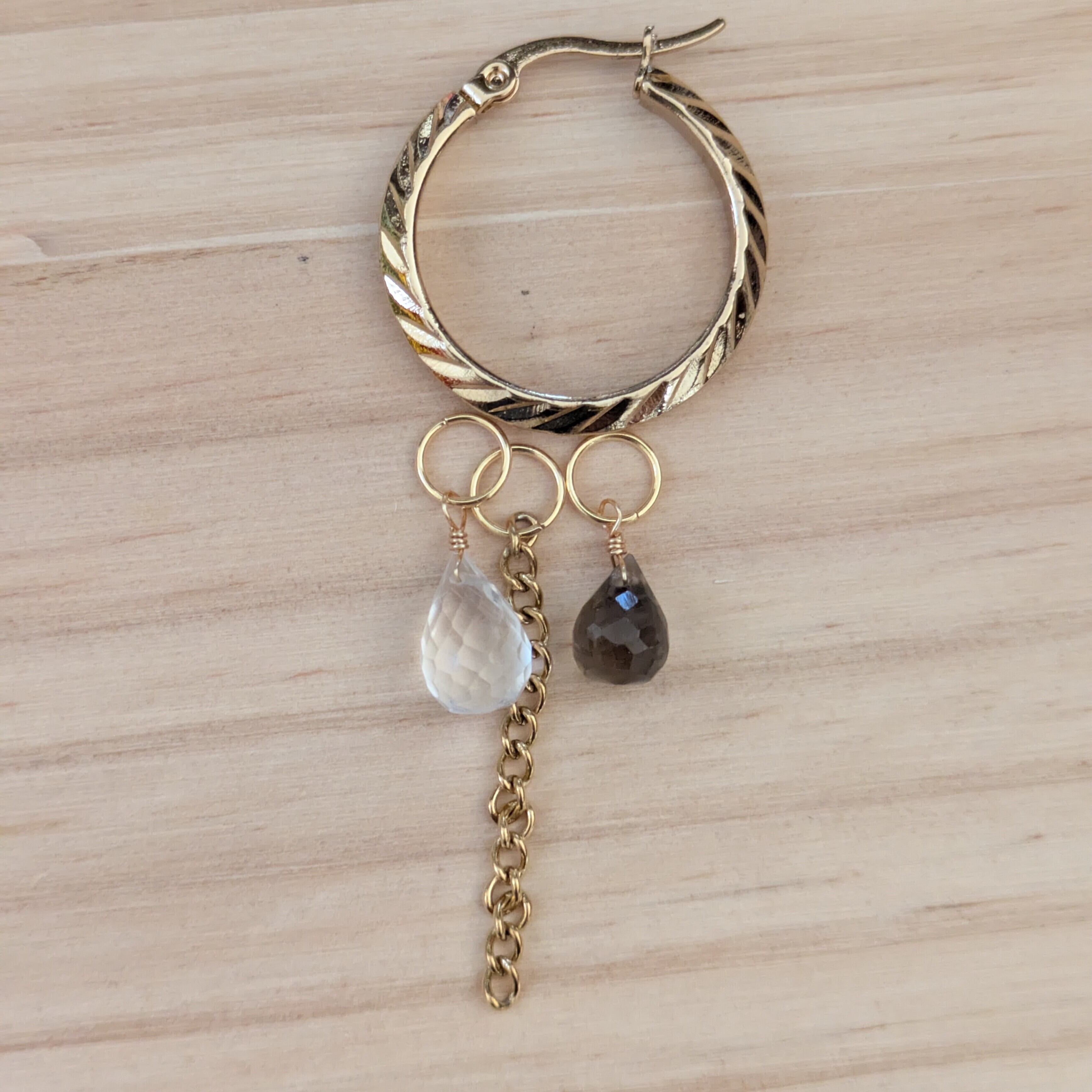 リーフ柄のサージカルステンレス製フープピアス。チャーム付替えができ、楽しむことができます。