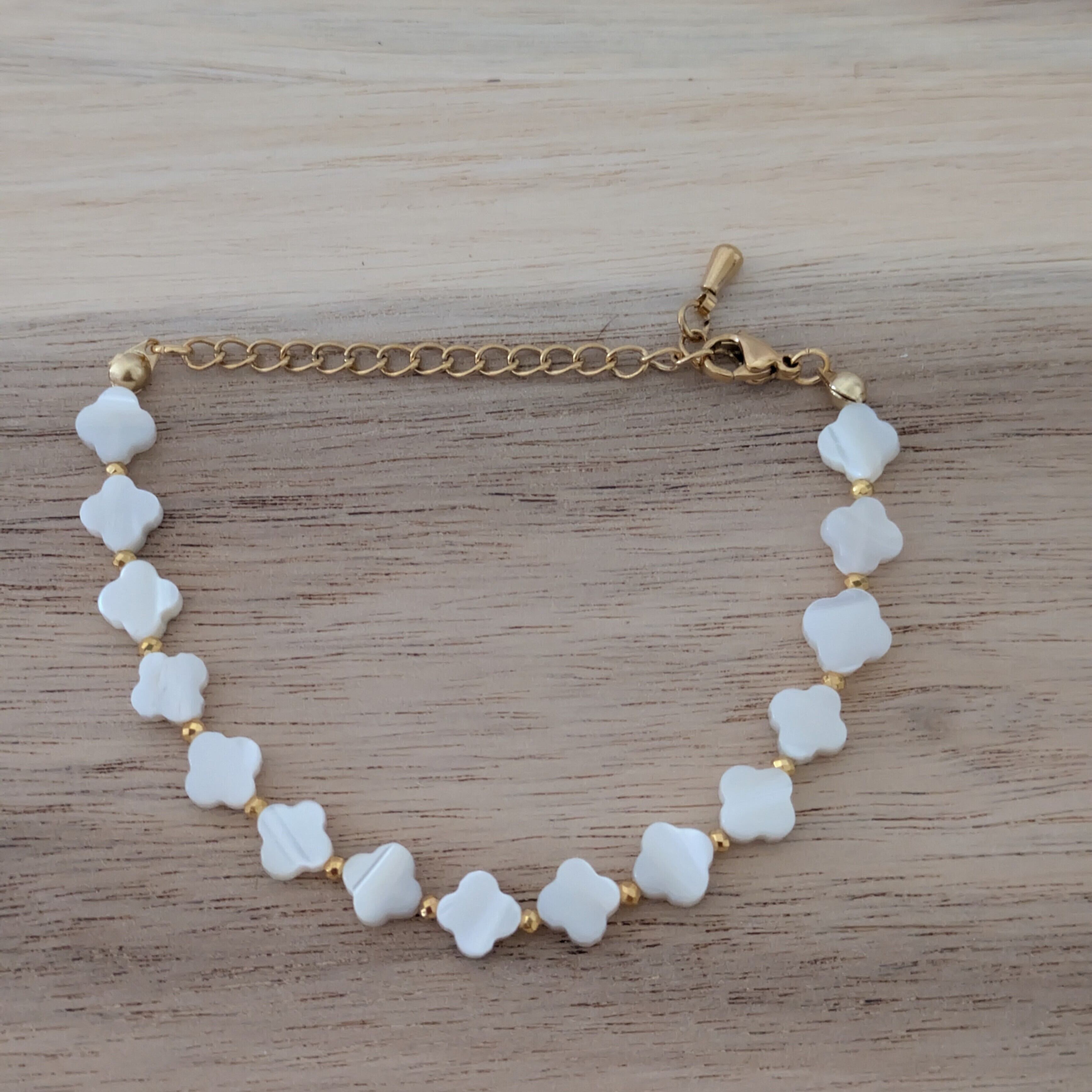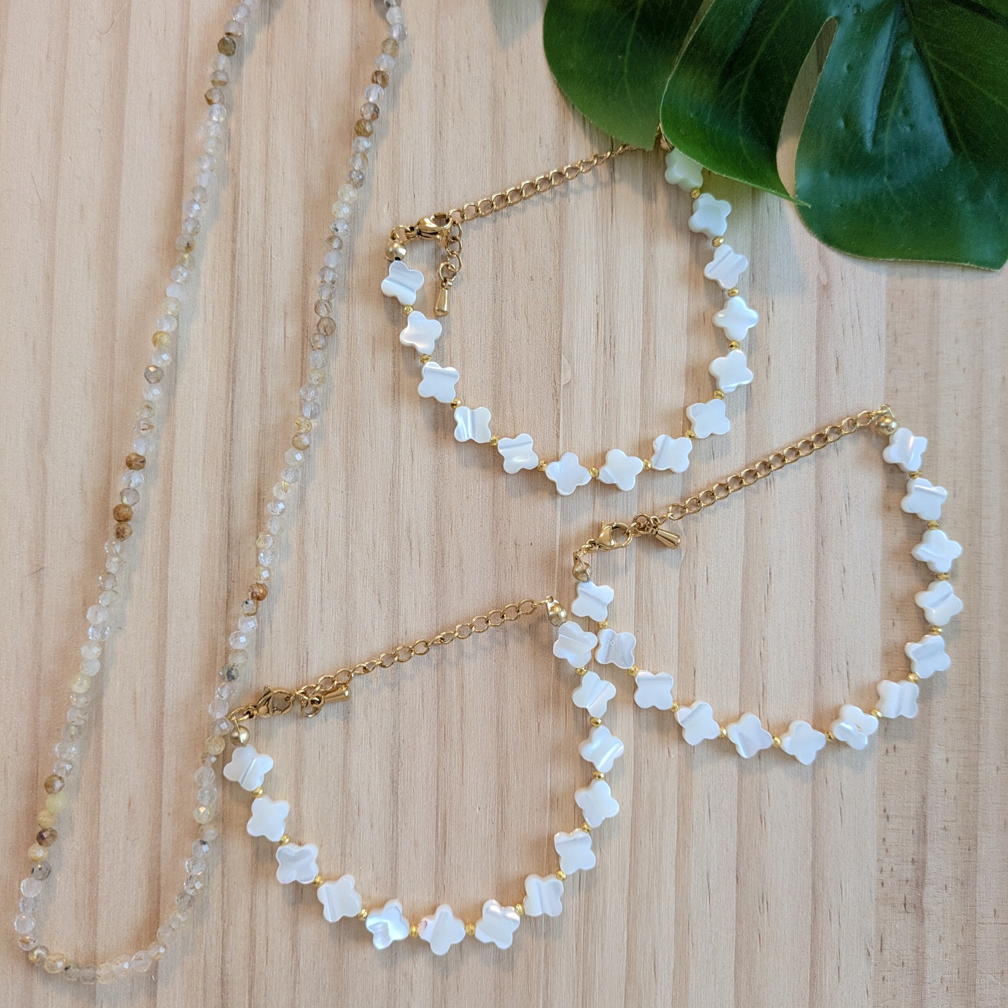 マザーオブパールのクローバーシェルとヘマタイトのゴールドビーズを合わせました。
