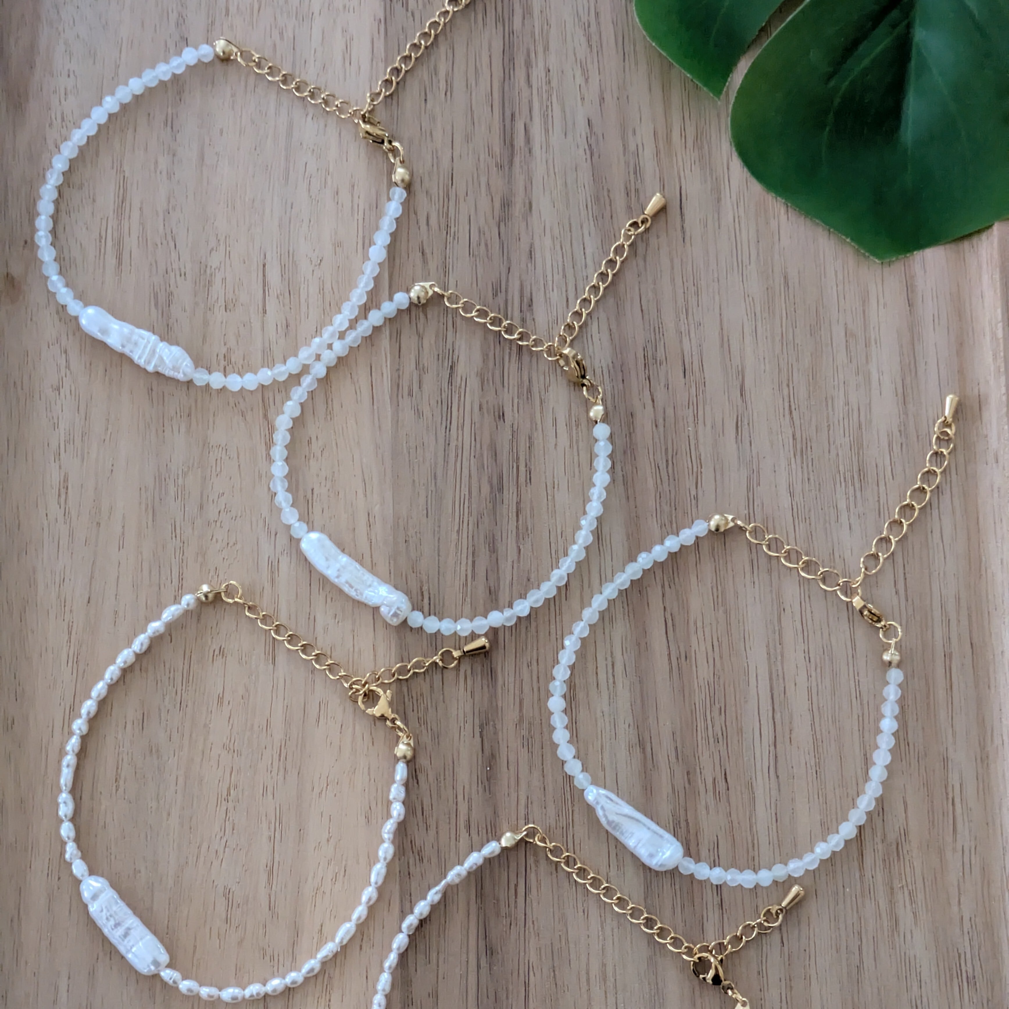 スティックパールとコーティングパールを組み合わせたツヤツヤ、キラキラなブレスレット。