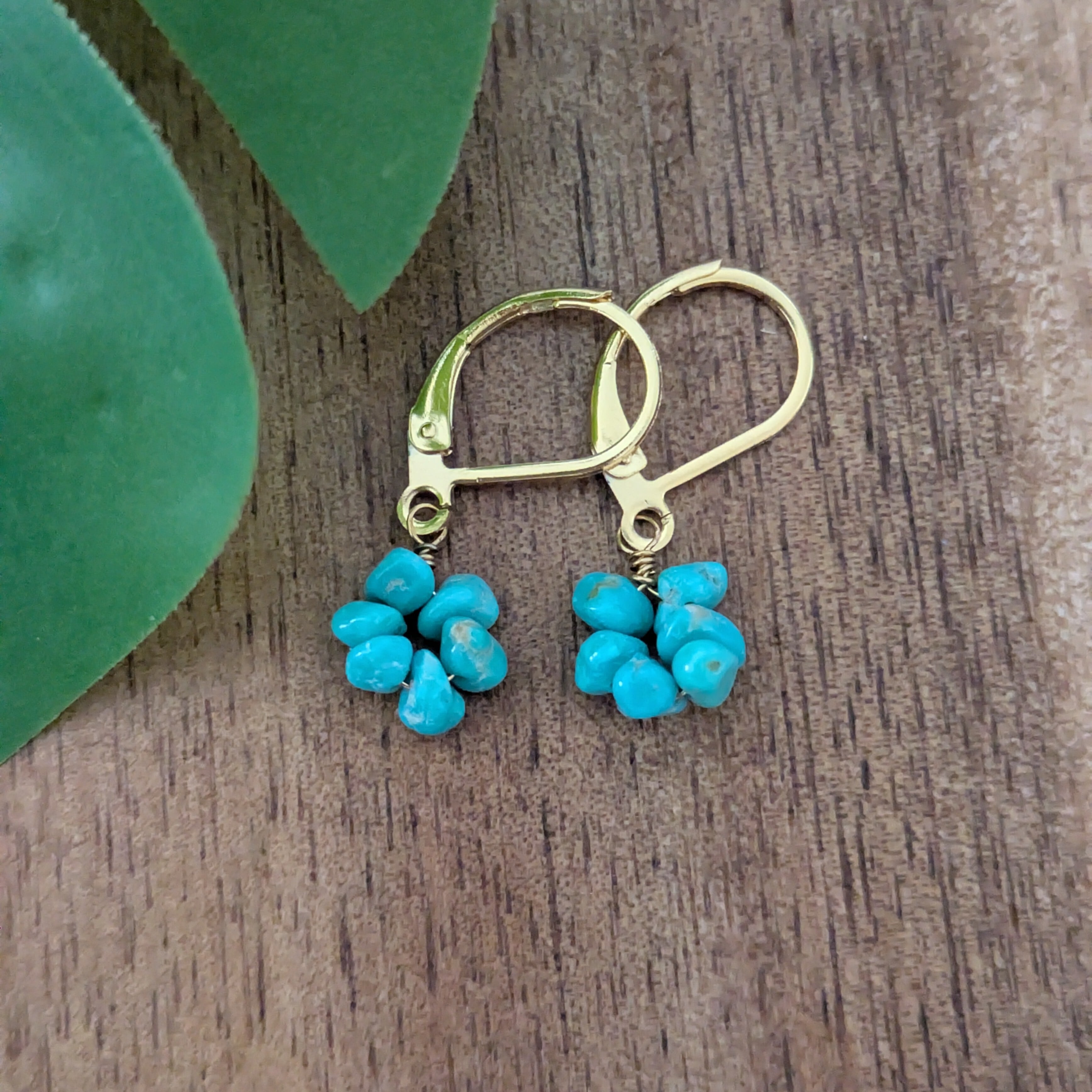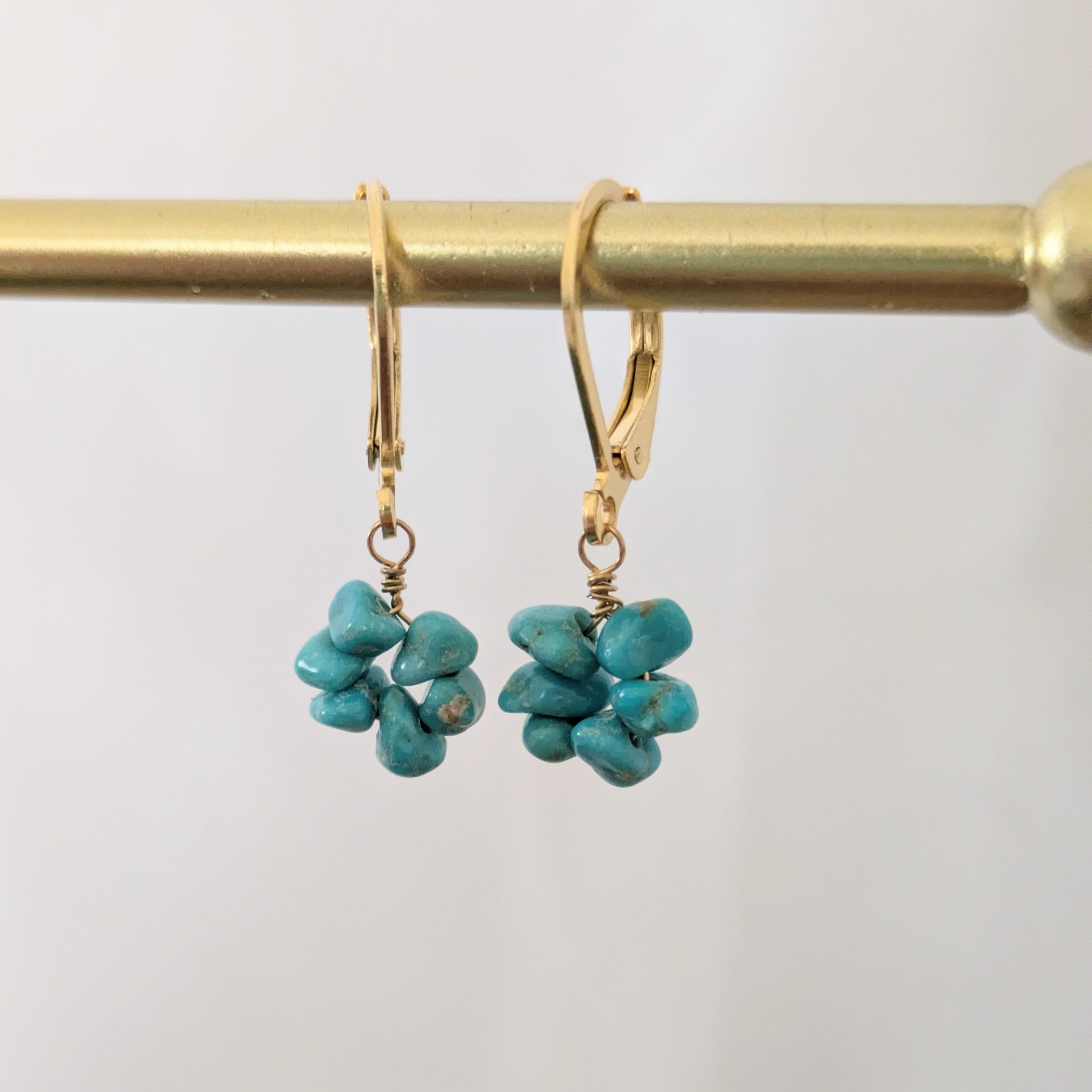 1年中活躍してくれるターコイズのフラワーピアスです。鮮やかなブルーが目を引きます。