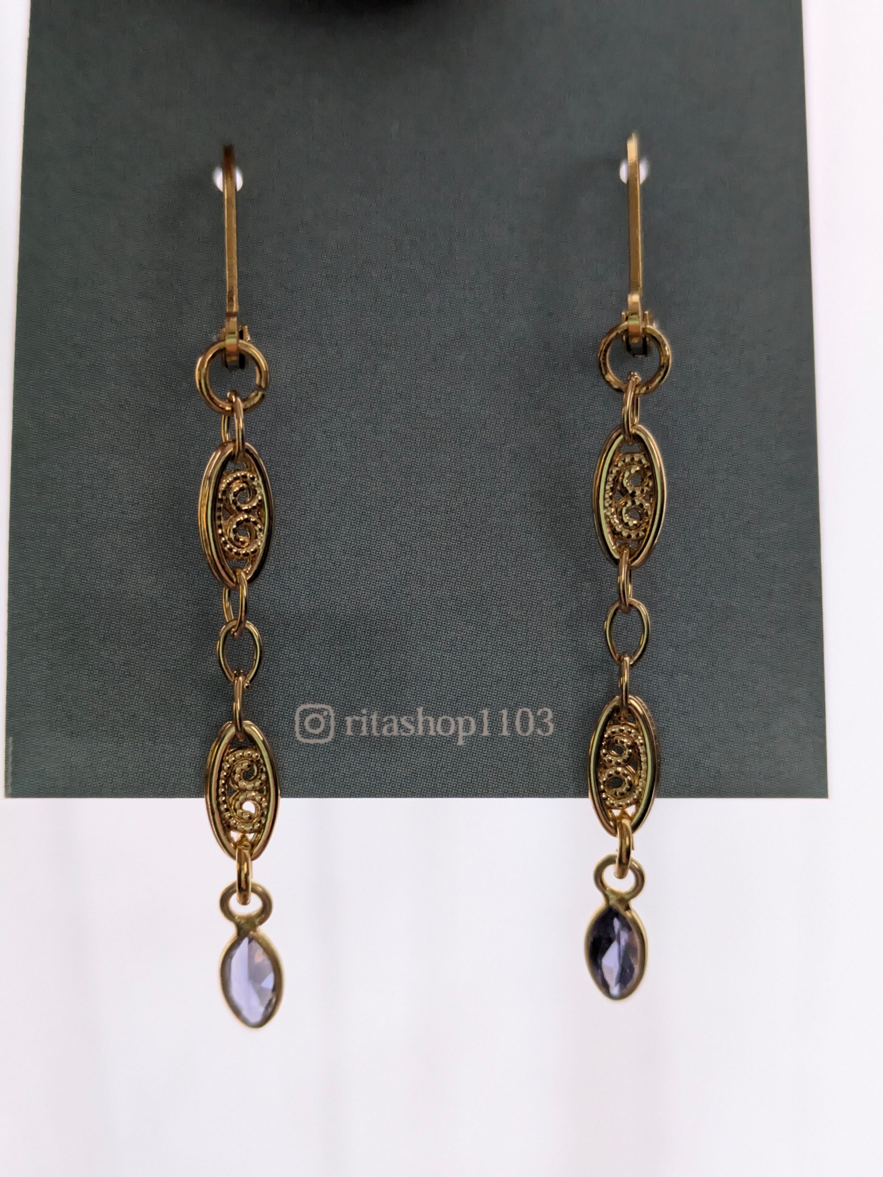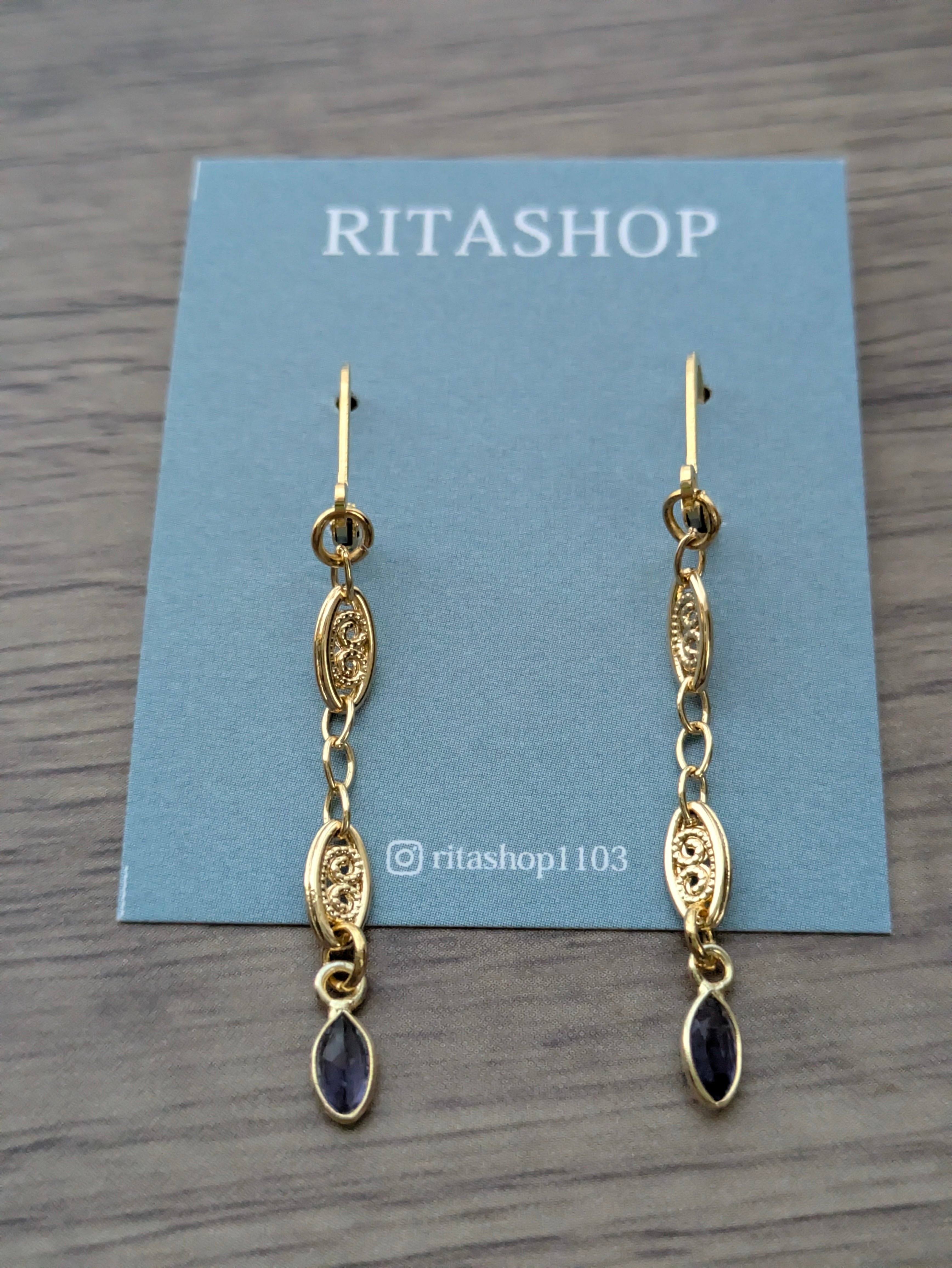 すみれ色のアイオライトにフェリグリーチェーンを繋いだチェーンピアス。