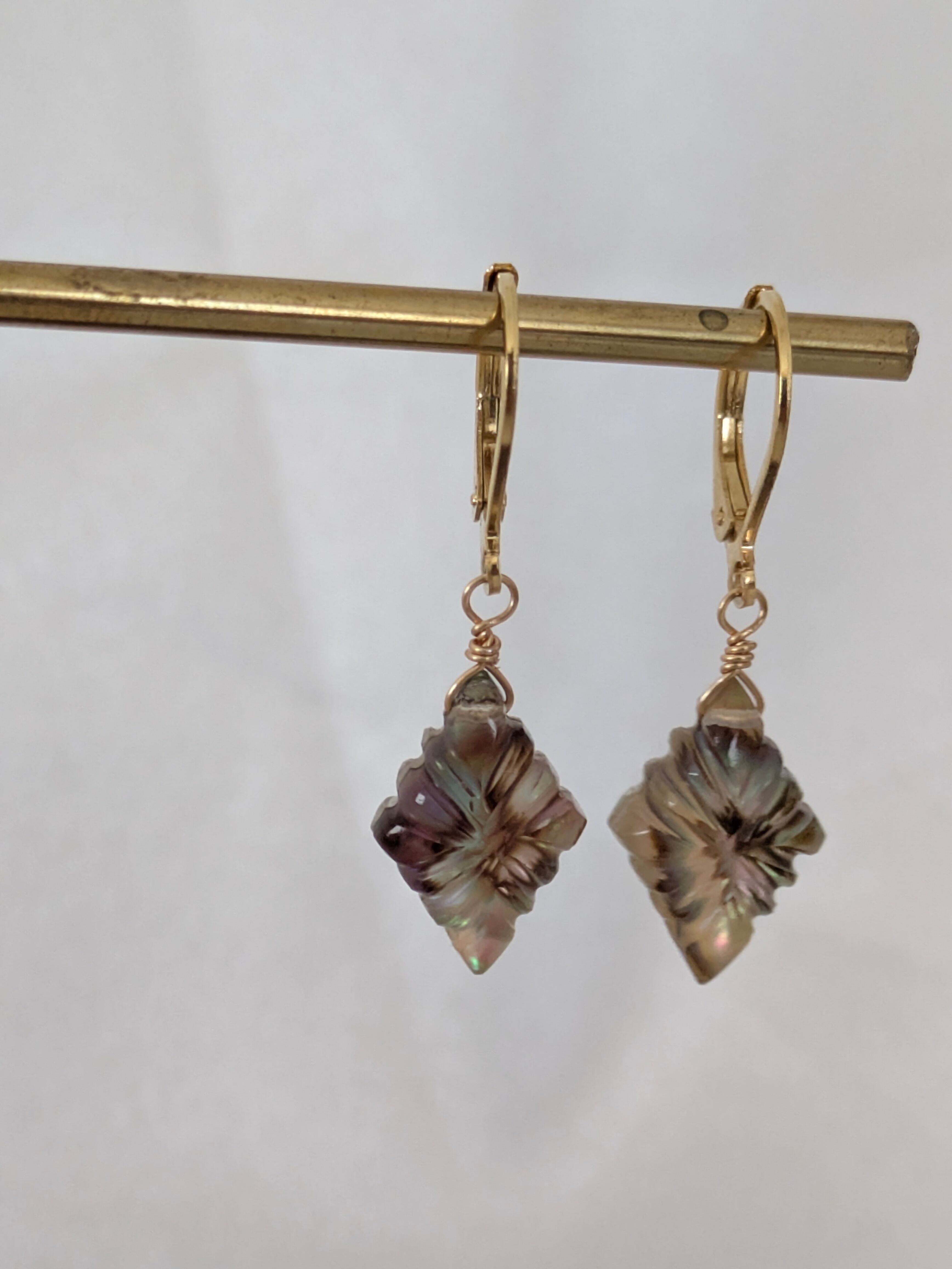 ローゼンジカービング(彫刻入ダイヤモンドカット)が施されたアバロンシェルと天然水晶の美しい虹色のストーンです。